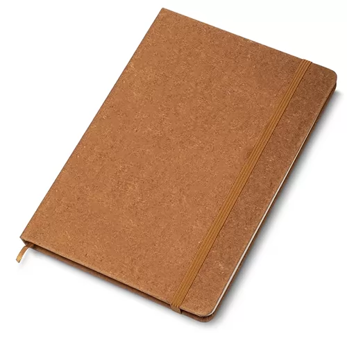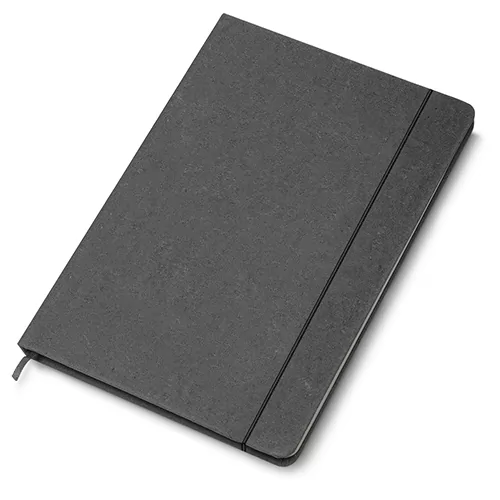 Descrição: Caderno de anotações capa dura reciclável com caneta metálica esferográfica azul, em detalhe reciclável e acionamento por rotação, elástico para lacre, suporte para caneta e marcador de página em cetim.