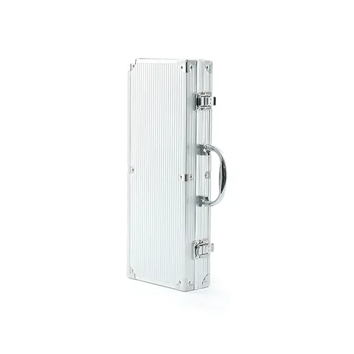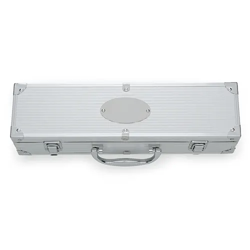 Descrição: Kit churrasco 5 peças em maleta de alumínio com travas de segurança, contém três facas de corte, tesoura e chaira. Parte interna da maleta com revestimento em tnt e suportes de velcro para fixação das peças.
