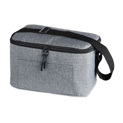 Descrição: Bolsa térmica 6 litros de poliéster. Contém bolso frontal com zíper, bolsos laterais telados, e alça transversal regulável em nylon (não removível) com apoio para ombro.