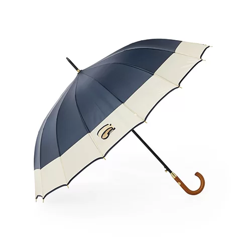 Descrição: Guarda-chuva de poliéster com abertura automática, estrutura metálica com 16 varetas e pegador em madeira.