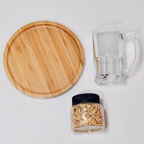 DESCRIÇÃO: Kit petisco com caneca e amendoim. Conta com petisqueira redonda em bambu; caneca em vidro; amendoim sem pele salgado 160g.