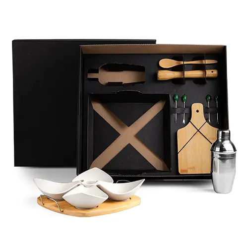 DESCRIÇÃO: Conjunto para caipirinha com petisqueira, coqueteleira, tábua e utensílios