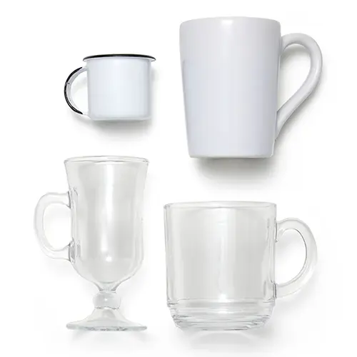 RECOMENDAÇÃO: Gravação a Laser nas canecas de vidro e alumínio; Gravação em Silkscreen na caneca de cerâmica.