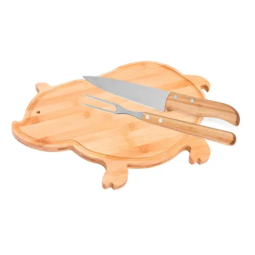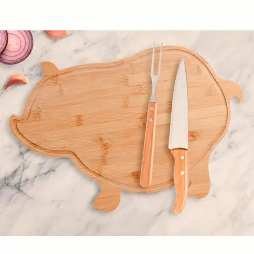 DESCRIÇÃO: Kit churrasco, petisco e cerveja. Conta com tábua em bambu com formato de porco e duas espátulas de 14 cm; faca 7″ e garfo trinchante em bambu/inox; 2 ramekins em porcelana e quatro taças para cerveja/drink .