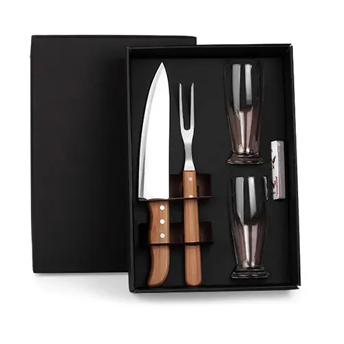 DESCRIÇÃO: Kit de copos e facas. Conta com dois copos de vidro para cerveja/drinks; faca 8″ e garfo trinchante em bambu/inox; jogo de baralho. Capacidade: 200ml cada copo.