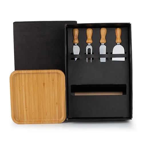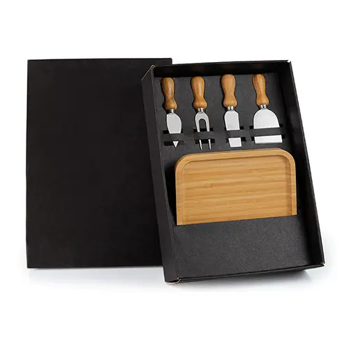 DESCRIÇÃO: Kit para petisco/queijo. Conta com petisqueira em bambu, duas facas, sendo uma com ponta e outra reta, garfo e espátula.