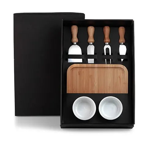 DESCRIÇÃO: Kit para petisco. Conta com petisqueira em bambu; conjunto para queijo contendo duas facas, sendo uma com ponta e outra reta, uma espátula e um garfo; conta também com dois ramekins em porcelana.
