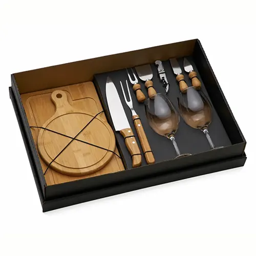 DESCRIÇÃO: Conta com tábua para Churrasco e tábua para frios em Bambu; Duas facas, uma espátula e um garfo para Queijo; Faca 8″ e garfo em Bambu/Inox; Abridor de Vinho em Inox; 2 taças em vidro.
