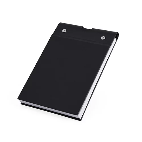 Descrição: Bloco de anotações em couro sintético com porta caneta. Possui aproximadamente 100 folha brancas sem pauta.