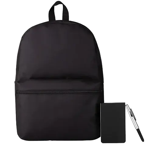 DESCRIÇÃO: Mochila preta confeccionada em Polyester 600D. Conta com bolso principal e bolso frontal em zíper horizontal, alças ajustáveis e alça de mão; bloco para anotações preto com 100 folhas não pautadas e picotadas; caneta esferográfica em ABS prata.