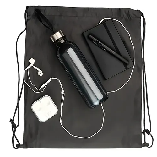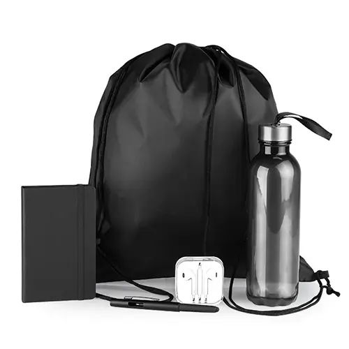 DESCRIÇÃO: Kit boas vindas. Conta com mochila em nylon 420, garrafa pet, fone de ouvido, caderno sem pauta e caneta esferográfica com tampa e ponta touch.