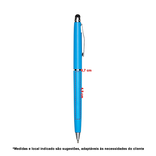 Descrição: Caneta plástica touch screen com acionamento por rotação e carga esferográfica azul 1mm.