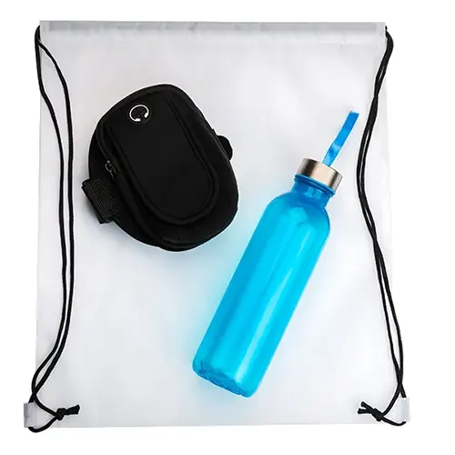 DESCRIÇÃO: Kit boas vindas. Conta com mochila em nylon 420 branca, garrafa pet na cor azul e braçadeira esportiva para celular.