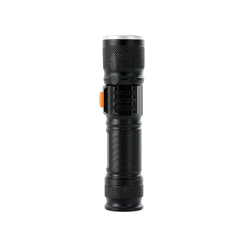 Descrição: Lanterna led recarregável com zoom de regulagem e três estágios de iluminação, material metálico. Acompanha cordão de nylon e cabo USB-V8.