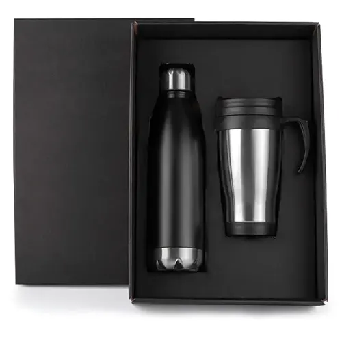 DESCRIÇÃO: Kit composto por garrafa em aço Inox preta com capacidade de 750ml e tampa rosqueável, conta também com caneca em polipropileno preto revestida em aço inox escovado.