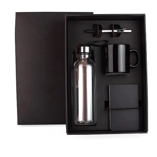 DESCRIÇÃO: Esse kit conta com garrafa transparente em PET, caneca em cerâmica preta, bloco para anotações preto e caneta esferográfica em ABS prata.