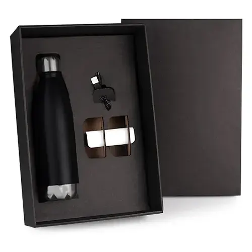DESCRIÇÃO: Garrafa em Aço Inox preta com tampa rosqueável e carregador portátil.